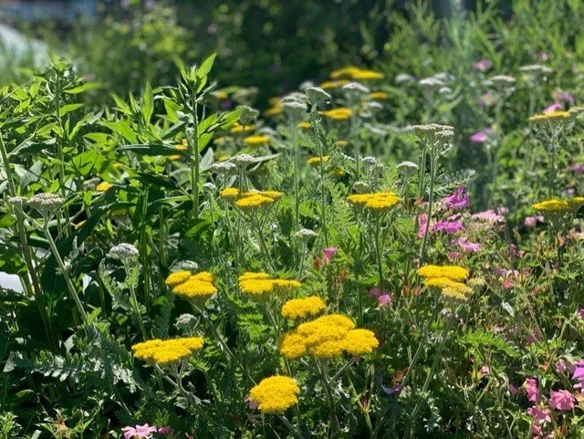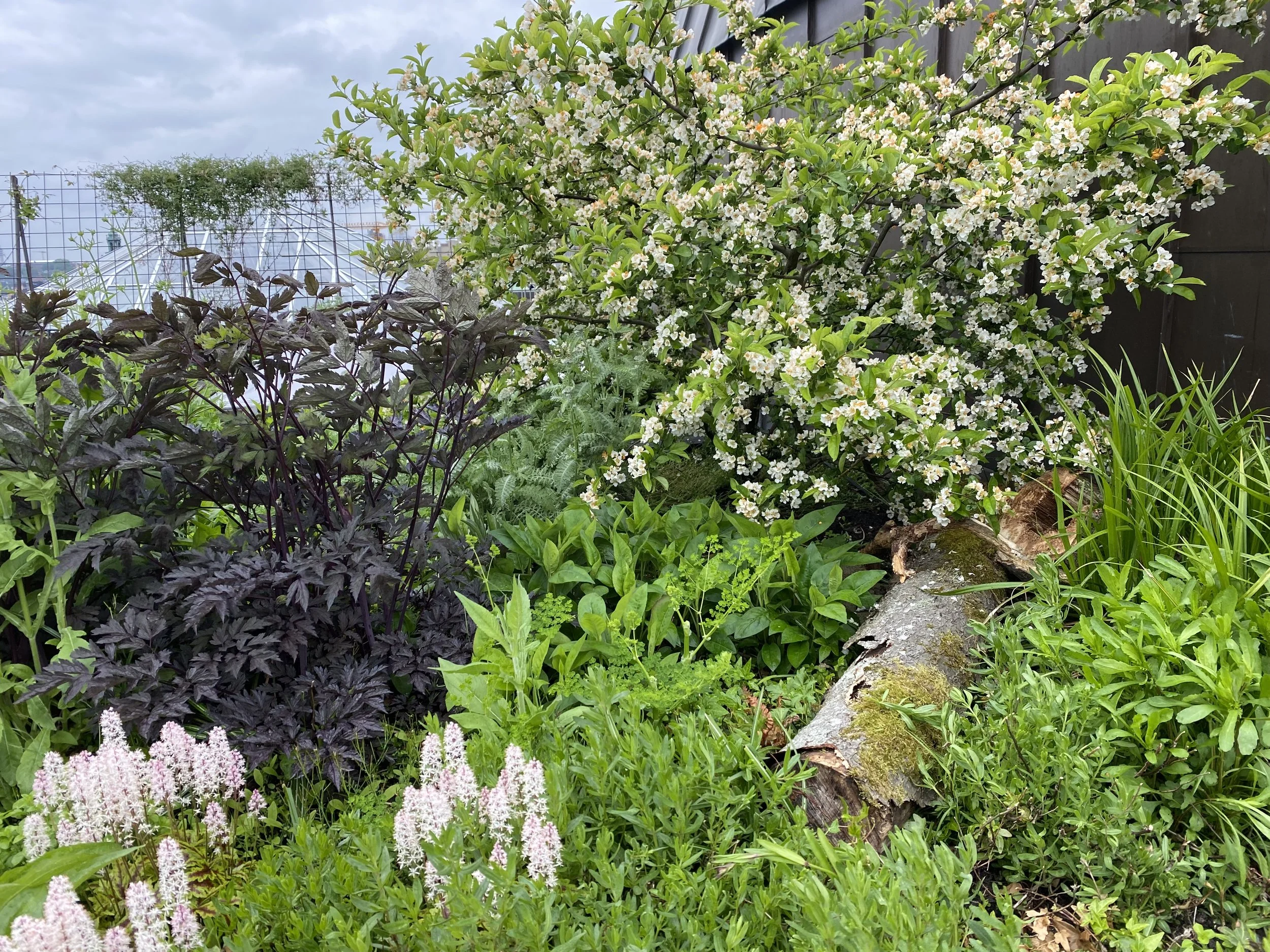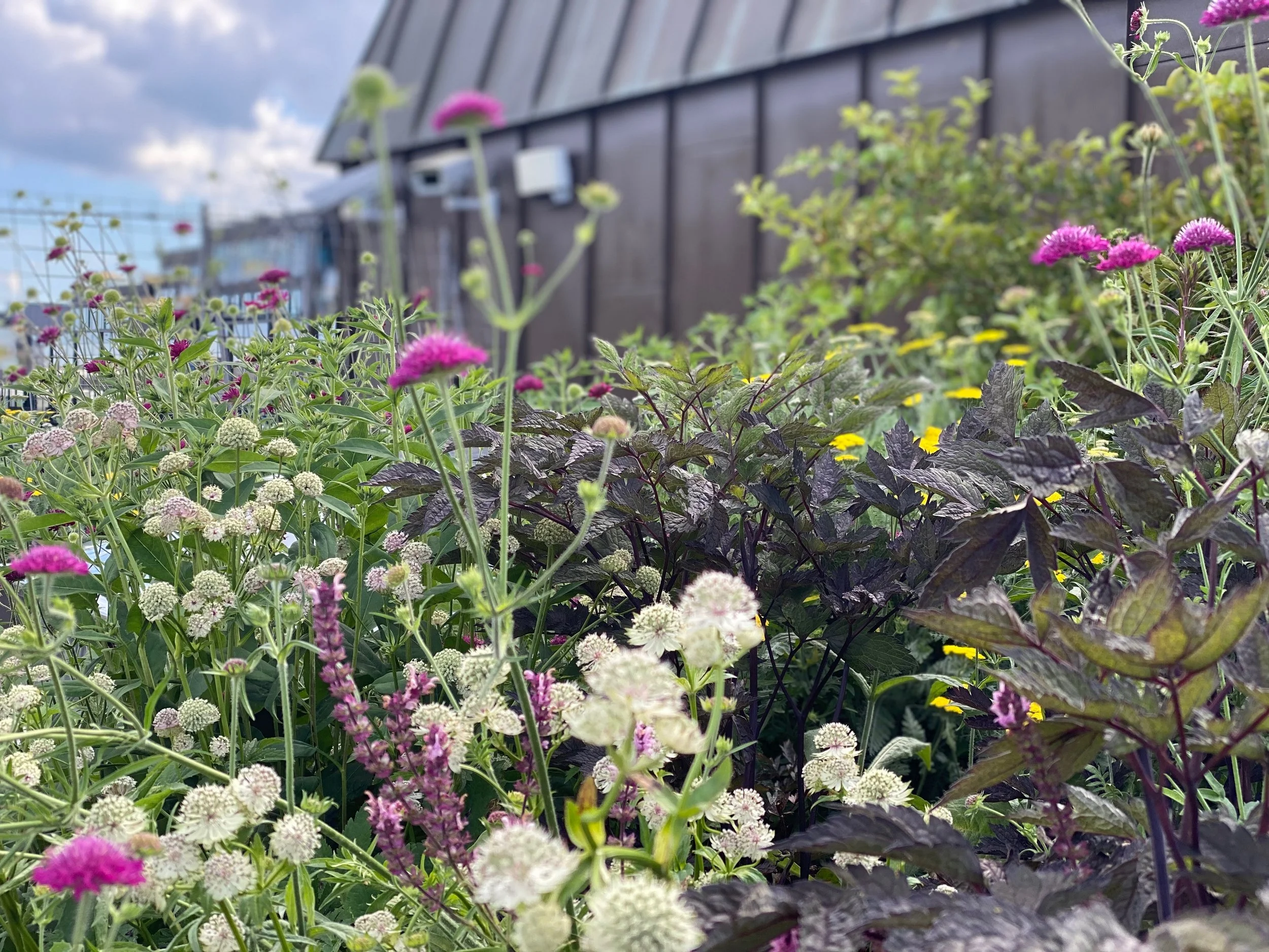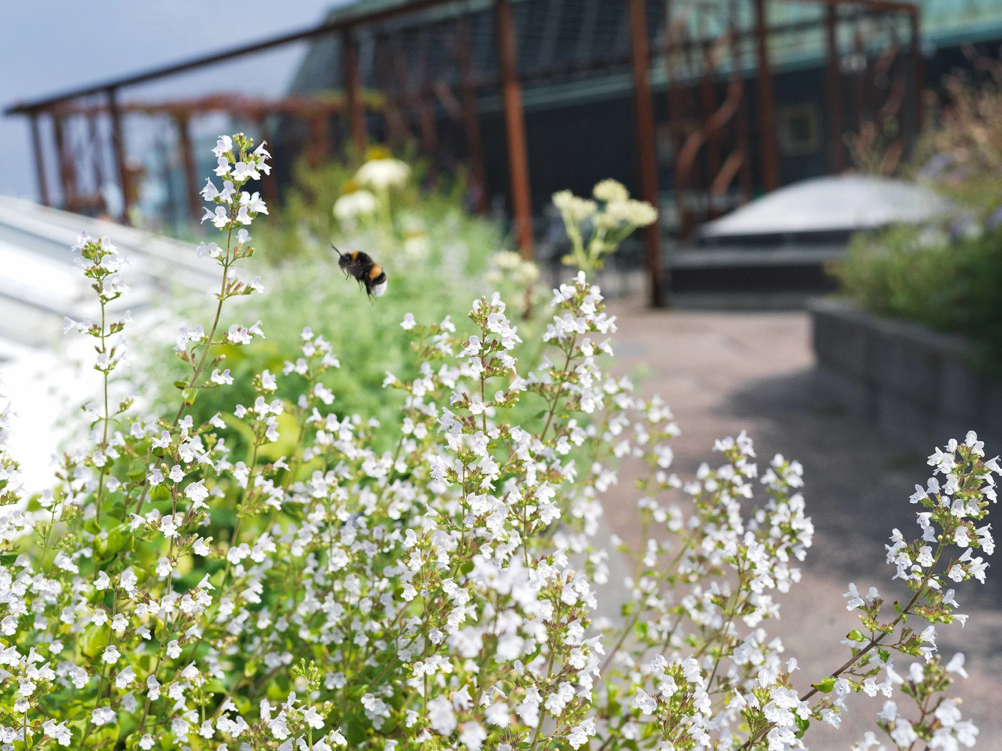 2018 fick vi uppdraget av Hufvudstaden att anlägga en urban oas för hyresgästerna men också för insekter och fåglar på NKs tak. Taket var en utmaning att gestalta tack vare alla lanterniner. Vi valde att bygga in dem i små rum med platsbyggda växtbäddar och bänkar och löst möblemang. Tovatt Arkitekter hjälpte oss också att rita den fina pergolan i järn som vi sedan brände in med linolja för att få den att åldras vackert. Här finns ätliga växter som kryddor, nypon och hagtorn som både människor och exempelvis humlor, blomflugor, fjärilar och fåglar kan nyttja. Trädgården har en varierad flora med växter, buskar rika på pollen och nektar till insekterna som blommar överhela säsongen samt gott om bär till stadens fåglar. Vi har även placerat ut dödved för nedbrytande insekter och svamp.