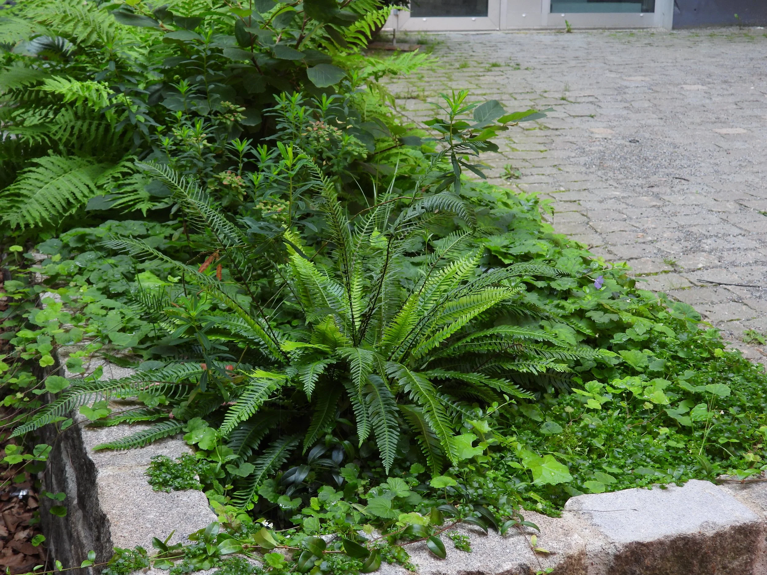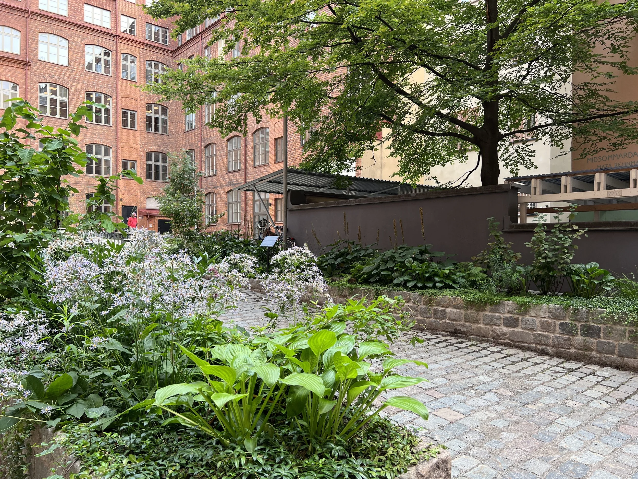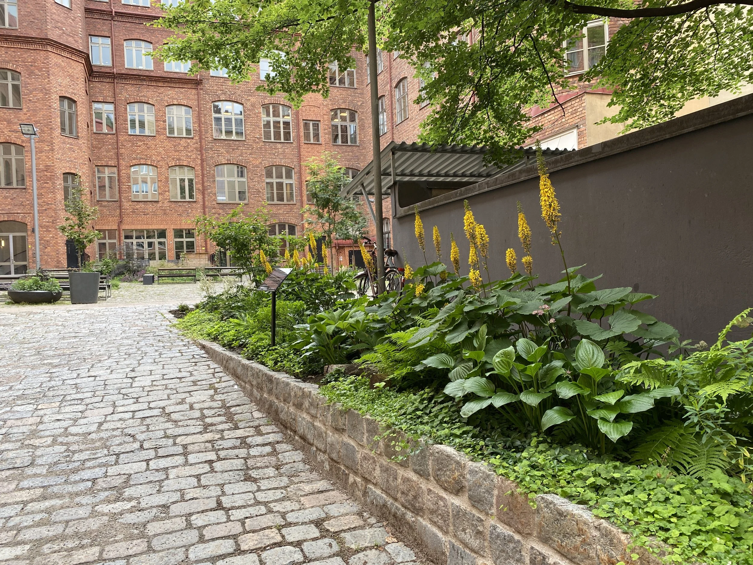 2022 fick vi uppdraget att förstärka denna vackra stenbelagda innergård med ekologiska och sociala värden. Vi ville behålla gårdens stämningsfulla karaktär med så små ingrepp som möjligt och bestämde oss tillsammans med KOD Landskap för att lägga ut “mattor” med vegetation. Vi bröt upp gatstenen i geometriska former och använde den som blev över till att bygga upp murar till bäddarna i den lägre sektionen av gården. Vi har anlagt mattorna med lämpliga växter för sol respektive skugga men också tagit hänsyn till dagvatten flöden som var en utmaning på gården. Efter att bäddarna kommit på plats är det lägre tryck på gårdens brunnar då bäddarna filtrerar och fördröjer dagvattnet. Gården har också ett skyltprogram och boplatser i form av dödved och en mulmholk.